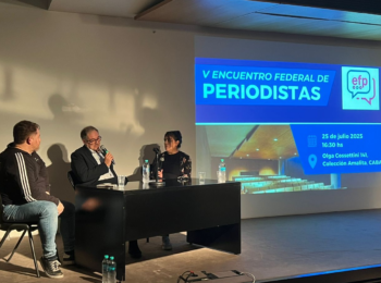 El V° Encuentro Federal de Periodismo convocó en la sede del museo Colección Fortabat, en Puerto Madero, a informadores de distintos puntos de la Argentina -Córdoba, Santa Cruz, Catamarca, Santiago del Estero y el AMBA- y el Uruguay -Montevideo-; en el cierre, Diego Cabot dialogó con Mariela Arias y Sergio Carreras sobre la investigación del siglo