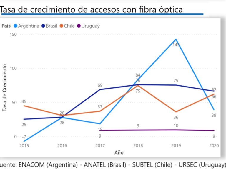 La Argentina tiene la peor penetración de la fibra óptica al hogar del Cono Sur y el ritmo de despliegue, que se había acelerado en 2018 y en 2019 duplicaba o triplicaba a la de los países vecinos, se redujo más del 70% en 2020. Un frenazo fortísimo que no es atribuible a la pandemia de Covid-19 si se lo compara con el desempeño de los países vecinos porque el mismo año la tasa de crecimiento en Uruguay se mantuvo estable, en Brasil cayó levemente -y permaneció en el rango de los cuatro años anteriores- y en Chile siguió creciendo.