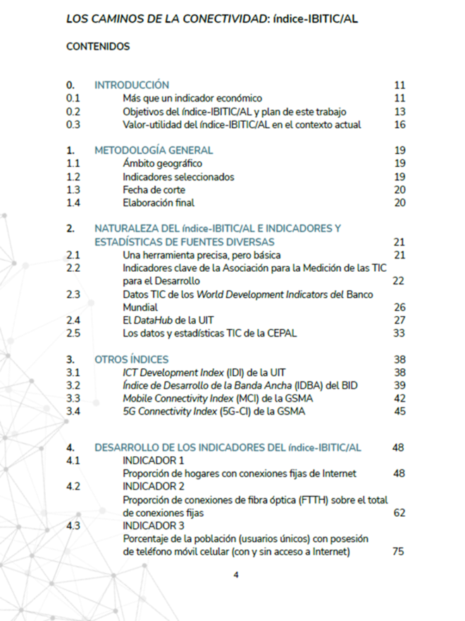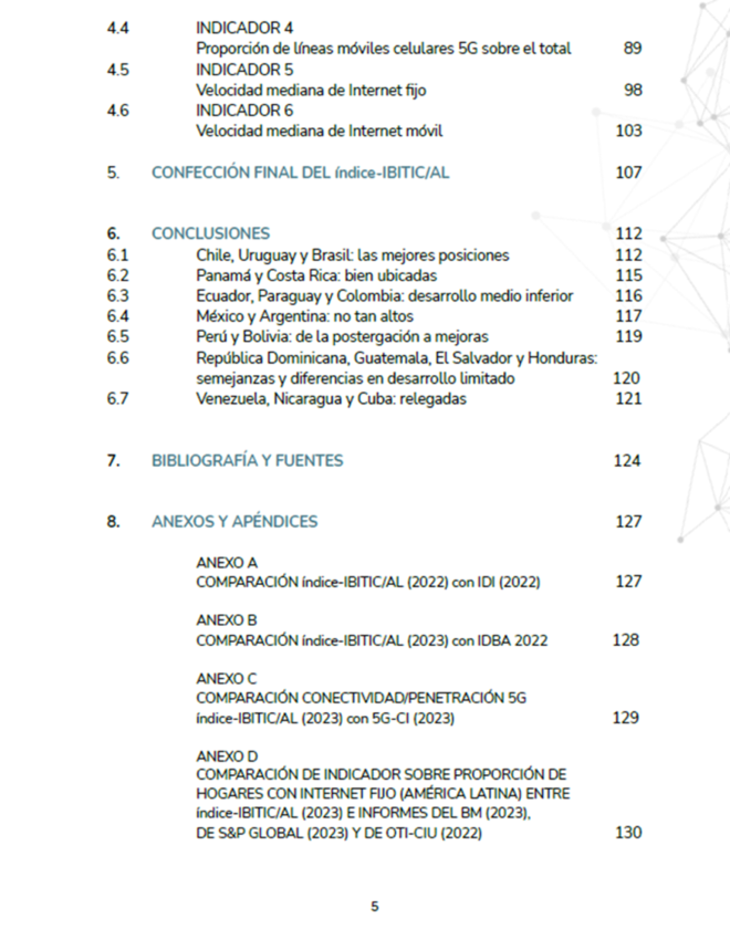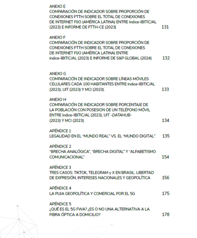 Por otro lado, y dado que la infraestructura de las TIC que se mide en el índice-IBITIC/AL no se desarrolla en un vacío, el libro Los Caminos de la Conectividad ofrece una serie de artículos, como Apéndices, en el cual figuran datos y análisis sobre aspectos que influyen en (y son influidos por) esas mismas tecnologías, tanto en América Latina como en el mundo.