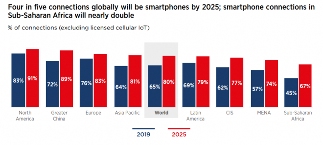 - El smartphone se está volviendo omnipresente: Según se prevé, los smartphones representarán cuatro de cada cinco conexiones para 2025, frente al 65 por ciento en 2019.