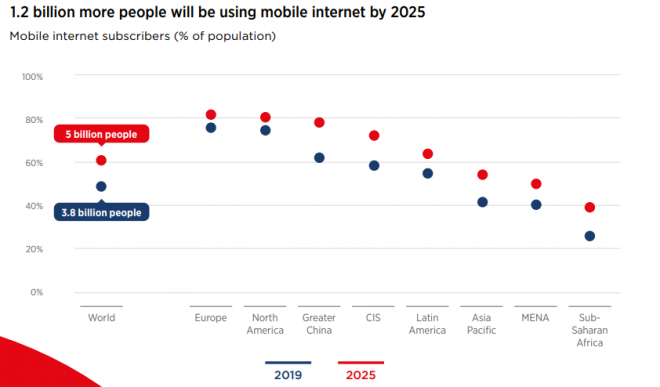 - El crecimiento de suscriptores se está desacelerando, pero la industria todavía tiene que conectar a más personas: El número de suscriptores móviles únicos a fines de 2019 era de 5,2 mil millones (67 por ciento de la población) y se estima que crecerá a 5,8 mil millones para 2025 (70 por ciento).