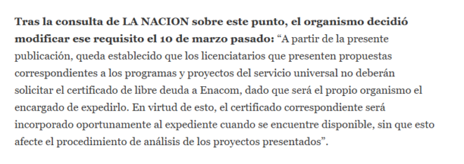 También se solicita que no existan deudas exigibles con el Enacom ni con el Estado Nacional. Estos certificados recuerdan al «libre deuda» requerido para acceder a los aportes no reintegrables (ANR) durante la gestión de Ambrossini y que generaron tanta controversia que el propio funcionario debió eliminar. Quedan expresamente excluidas del financiamiento actividades como la contratación de personal, servicios profesionales o pagos de obligaciones derivadas de contratos financieros preexistentes.