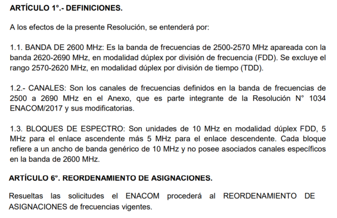 En la resolución del Enacom de diciembre, se identificaron las bandas de 1500 Mhz: 1427-1518 Mhz; AWS-3: 1770-1780 Mhz / 2170-2200 Mhz; 2300 Mhz: 2300-2400 Mhz; 3500 Mhz: 3300-3600 Mhz; 26 Ghz: 24,25-25,75 Ghz; 38 Ghz: 37-43,5 Ghz. En las de 26 Ghz (milimétricas), 2300 Mhz y la de 1400 Mhz hay margen para trabajar en la reatribución, recanalización (pasar de canales más chicos a más grandes, de 20 a 100 megas por ejemplo, y de FDD a TDD) y en una reorganización general del espectro sobre el que podría desarrollarse 5G en el país.