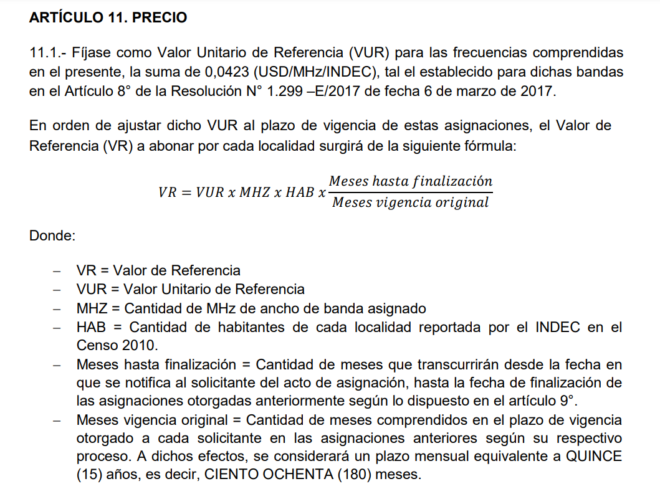 Los valores establecidos son los mismos que los de la asignación directa de 2017: 0,0423 dólares por habitante de la localidad a la que se aspire. En este sentido, el gobierno mantiene el criterio de asignar espectro por localidad en lugar de hacerlo por región o directamente comprender todo el territorio (dado que las bandas se repartirán solamente entre tres operadores podría haberlo hecho). Según especialistas consultados para este artículo, los operadores no van a comprar donde no les convenga (haciendo lo que en la jerga se conoce como cherry picking ciudad por ciudad) y dejarán áreas sin utilizar. Haber cambiado el criterio hubiera permitido aprovechar mejor las bandas, dado que algunas podrían quedar ahora sin uso en área rurales comercialmente no apetecibles.