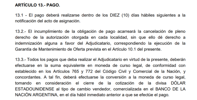 El artículo 13.5 del pliego introduce el tema de las interferencias. En 2017, la administración Macri intentó resolver la cuestión mediante descuentos de precio en las bandas que estuviesen interferidas. Ahora, cinco años después, la incorporación de una cláusula de interferencia se parece a una garantía ofrecida a o solicitada por los operadores, que no confían en la higiene radioeléctrica del gobierno.