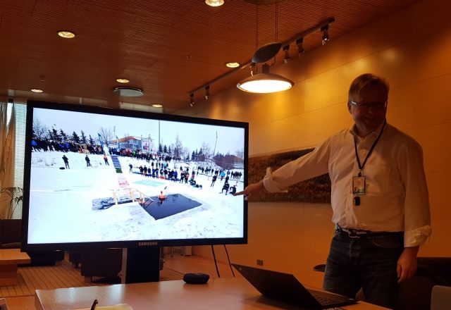 Jukka Häyrynen, director ejecutivo de startups de Tekes explica en Team Finland House cómo ha venido funcionando esa agencia oficial y bromea sobre los tipos de pitch que realizan los emprendedores, en los que usualmente tienen muy poco tiempo para explicar su proyecto. Salvo un pitch especial, en el que el emprendedor tiene todo el tiempo del mundo siempre que de cuenta de su proyecto metido en el agua helada de un lago congelado en el invierno. Y muestra la foto. Humor finlandés.