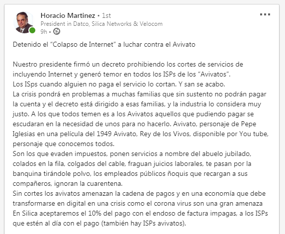Sobre el decreto que prohíbe los cortes de servicio por falta de pago: «A os que todos temen es a los Avivatos aquellos que pudiendo pagar se escudaran en la necesidad de unos para no hacerlo. Avivato, personaje de Pepe Iglesias en una película del 1949 Avivato, Rey de los Vivos, disponible por You tube, personaje que conocemos todos. Son los que evaden impuestos, ponen servicios a nombre del abuelo jubilado, colados en la fila, colgados del cable, fraguan juicios laborales, te pasan por la banquina tirándote polvo, los empleados públicos ñoquis que recargan a sus compañeros, ignoran la cuarentena. Sin cortes los avivatos amenazan la cadena de pagos y en una economía que debe transformarse en digital en una crisis como el corona virus son una gran amenaza».