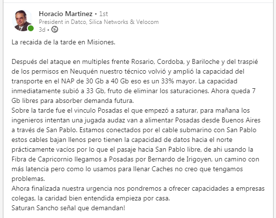 Horacio Martínez, presidente de Datco, Silicon Networks y Velocom, viene analizando en su perfil de Linkedin el desempeño de la conectividad en la Argentina y en su propia red en lo que ya es una estrategia de comunicación única para una compañía TIC: él mismo va analizando y publicando los desafíos, dificultades y caídas de su red y las alternativas de solución encaradas. Y lo hace en textos breves y sin mayores complejidades técnicas.