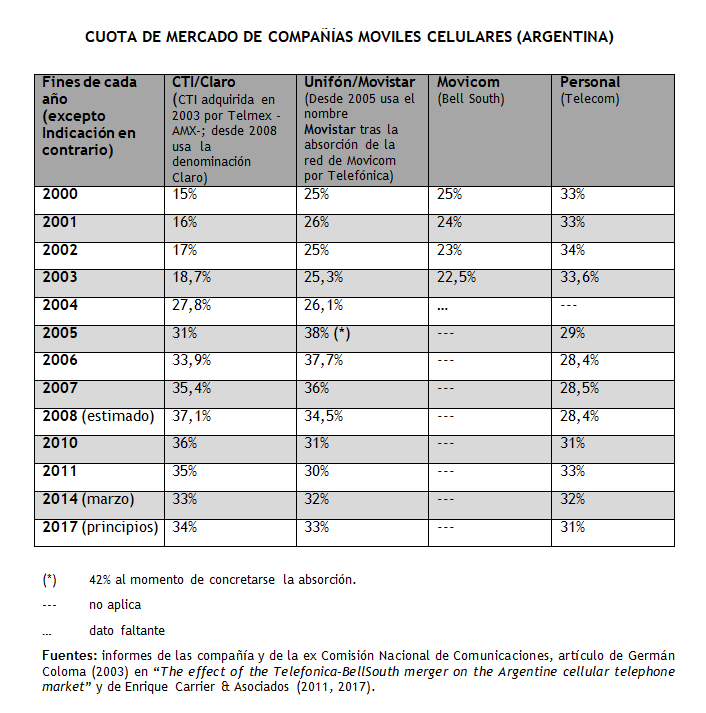 La existencia de tres compañías celulares ofrece un nivel de competencia muy similar al de toda América Latina y buena parte del mundo. El hecho de que ninguna prestadora tenga más de un tercio del share y que en dos décadas tampoco ninguna haya sobrepasado el 38% (excepto si consideramos el breve periodo del 42% de Movistar) implica que el mercado celular argentino es sano si tenemos en cuenta estos factores.