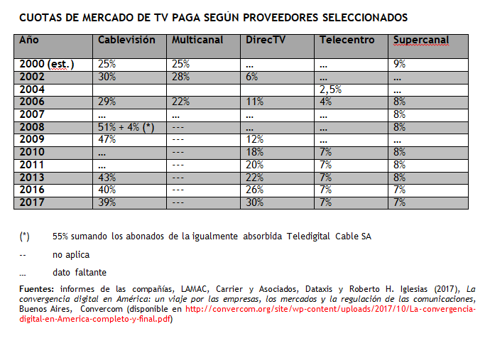 El share trepaba al 55% si se sumaban algunas compañías adicionales de cable que también entraron en la transacción, en particular Telecable, que prestaba servicio en la zona del Comahue, Misiones, Corrientes y otros puntos.