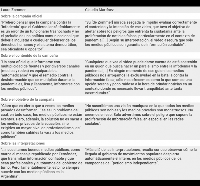 Hablemos de Infodemia, el spot que enfrentó a Laura Zommer y Claudio Martínez. En una columna de opinión para El Diario AR, la directora ejecutiva de la ONG Chequeado expresó su preocupación por la campaña lanzada por el Gobierno nacional contra sobreabundancia de información y rápida propagación de contenidos falsos. La frase que habría dado lugar a la crítica se encuentra al final del video animado: “No se automedique. Consulte a los medios públicos”. La reflexión de Zommer puso el foco en que el spot deja entrever que “el remedio contra la desinformación que se multiplicó durante la pandemia es, lisa y llanamente, informarse con los medios públicos”. A su vez, explicó que el planteo es “peligroso y erróneo”, “a menos que suponga que el partido mayoritario quiere transparentar una vocación de ser una voz única”. Un día después de la publicación, el 10 de mayo, a través del portal de la agencia estatal Télam, respondió Claudio Martínez, subsecretario de Medios y director ejecutivo de la TV Pública: “Zommer intenta darnos clases de ética e independencia periodística; busca marcar la cancha sobre lo que deben y no deben hacer los medios públicos, e inventa una motivación imposible de detectar en el mensaje en cuestión”. A continuación te resumo el debate: