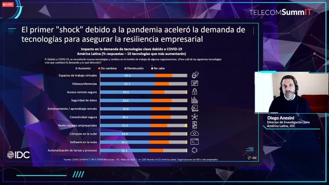 En primera instancia destacó cuáles fueron las tecnologías que tuvieron mayor demanda por parte de las empresas, entre las cuales se encuentran: espacios de trabajo virtuales, videoconferencias, acceso remoto seguro y seguridad de datos. Además, subrayó que “3 de cada 4 organizaciones colocan sus esfuerzos de transformación en crecer, innovar y cerrar la brecha digital”.