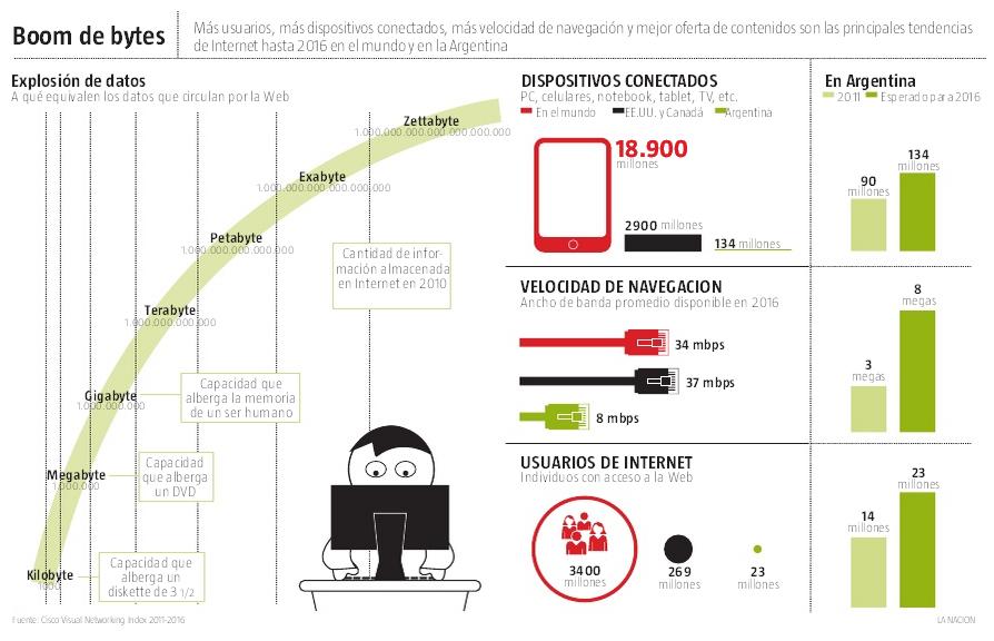 El futuro de la Web es promisorio en el mundo y en la Argentina. Todo es crecimiento. En 2016, habrá 23 millones de usuarios y 134 millones de dispositivos conectados a la Web en la Argentina, que en 2011 tuvo 14 millones de usuarios y 90 millones de PC, notebooks, netbooks, celulares y TV conectados. Pero además de crecer en la base de usuarios, también lo hará en la velocidad de conectividad, probablemente lo que más interesa a los internautas actuales.
