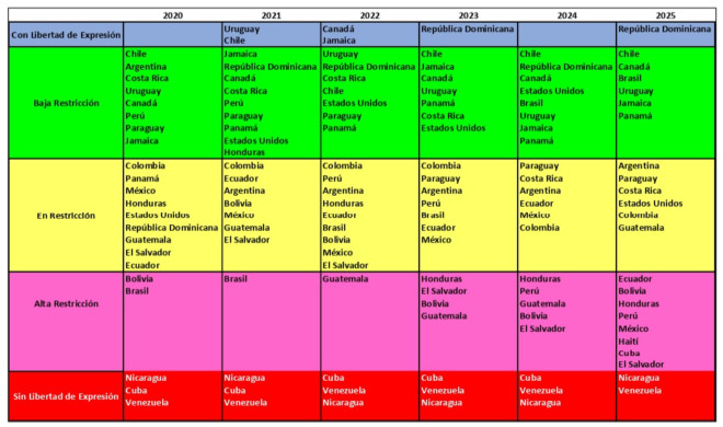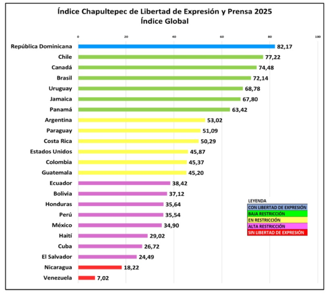 El índice muestra una tendencia negativa en gran parte del hemisferio. República Dominicana encabeza la clasificación con 82,17 puntos, siendo el único país ubicado en la categoría “Con libertad de expresión”.