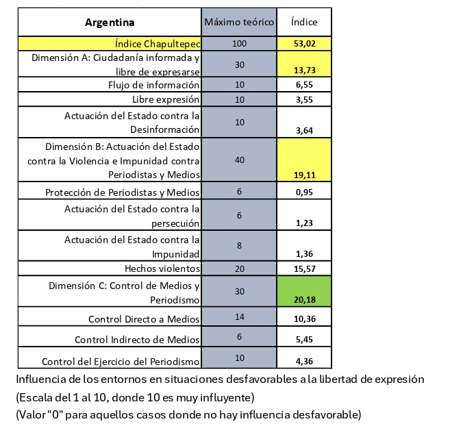 Las evaluaciones por dimensión muestran resultados dispares. La categoría “Ciudadanía informada y libre de expresarse” obtuvo 13,73 puntos sobre 30, la puntuación más baja entre los tres indicadores analizados. La dimensión “Actuación del Estado contra la violencia e impunidad contra periodistas y medios” alcanzó 19,11 puntos sobre 40, mientras que “Control de medios y periodismo” registró 20,18 puntos sobre 30.