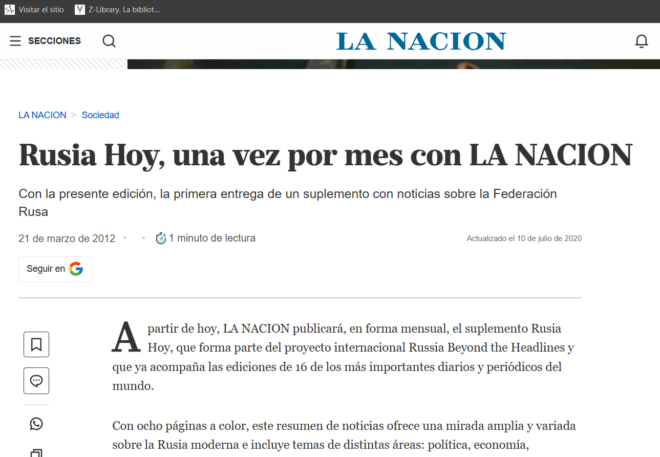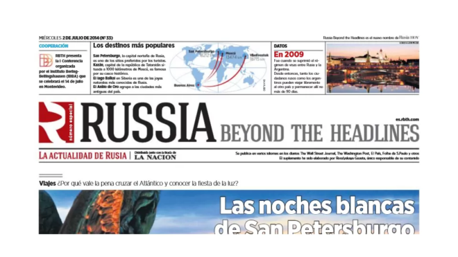 «Rusia Hoy, una vez por mes con La Nación« tituló ese diario el 21 de marzo de 2012 un pequeño recuadro que anunciaba el lanzamiento de un suplemento especial que se insertaría junto con la edición del periódico. Allí se explicaba que la edición formaba parte del «proyecto internacional Russia Beyond the Headlines» y que para entonces ya acompañaba «las ediciones de 16 de los más importantes diarios y periódicos del mundo».