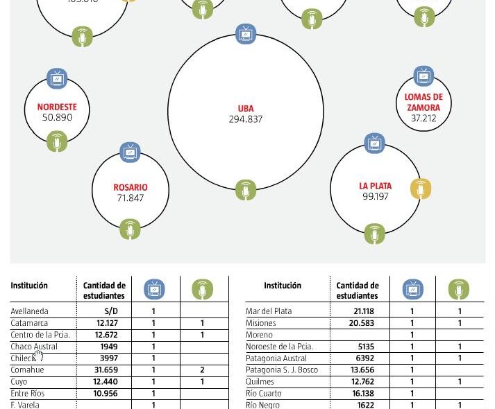 Si bien Afsca autorizó una frecuencia por casa de estudio, las universidades que conformarán importantes multimedios son las de Córdoba, La Plata y Santa Fe, las tres que cuentan con décadas de experiencia en el sector por sus emisoras AM. A ese grupo se podrían sumar la UBA, si finalmente instala su canal en el aire porteño. Y la de Tucumán, que también tiene larga trayectoria en TV. Además, estas cinco universidades están entre las más importantes en cantidad de estudiantes y carreras.