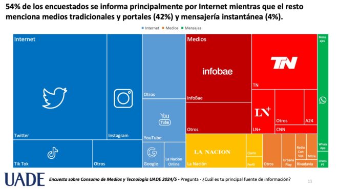 Según los datos relevados, el 54% de los encuestados señala a Internet como su principal fuente de información, frente al 42% que aún menciona medios tradicionales y portales, y un 4% que recurre a la mensajería instantánea. Dentro del universo digital, Twitter/X, Instagram, TikTok y YouTube concentran la mayor parte de las menciones en redes sociales, mientras que Infobae, TN y La Nación lideran entre los medios y portales de noticias. WhatsApp, por su parte, se consolida como canal informativo informal de alcance transversal.