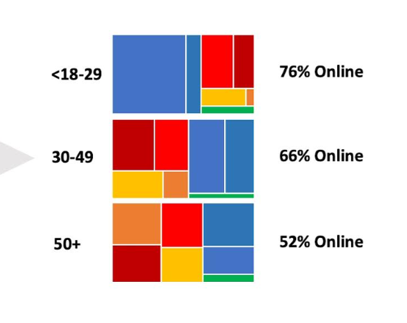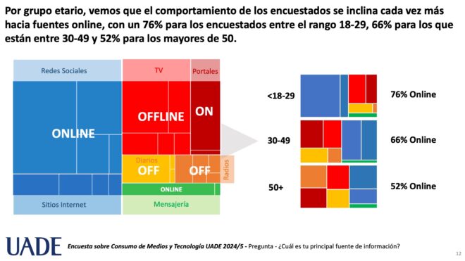 El análisis por grupo etario revela que la transición hacia lo digital no es homogénea. Entre los encuestados de 18 a 29 años, el 76% se informa principalmente por fuentes online. En el segmento de 30 a 49 años, ese porcentaje desciende al 66%, y entre los mayores de 50 años llega al 52%. Aun así, este último dato merece atención: más de la mitad de los encuestados de mayor edad ya privilegia los canales digitales como fuente de información, lo que indica que la transformación no es exclusiva de las generaciones más jóvenes.