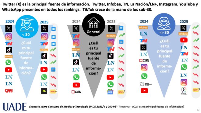 La comparación entre las ediciones anteriores de la encuesta permite identificar tendencias significativas. Twitter/X mantiene el primer lugar como fuente de información en todos los segmentos analizados -menores de 30, mayores de 30 y público general-, seguido por Infobae, TN, La Nación/LN+, Instagram, YouTube y WhatsApp, plataformas que aparecen de forma consistente en todos los rankings.