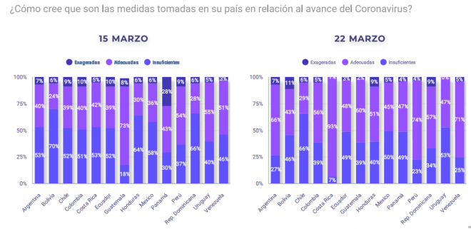 Los datos se desprenden del segundo sondeo realizado por Livepanel, startup tecnológica que realiza estudios mediante celulares, sobre la percepción del coronavirus Covid 19 en países latinoamericanos (aquí están las conclusiones principales de la primera ola). El estudio incluyó de 36 preguntas, alcanzó unos 4352 casos e 14 países, de entre los cuales 479 corresponden a la Argentina, y se realizó 21 y 22 de marzo. Livepanel cuenta con un panel permanente en tiempo real y prevé hacer nuevas olas diarias para analizar el comportamiento de la opinión pública regional acerca de la pandemia.