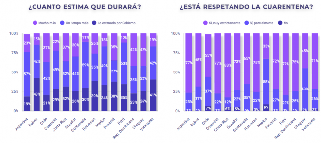 El 77% está respetando la cuarentena «muy estrictamente», el 20,5% «parcialmente», y el 2% no la está respetando. Entre quienes no la respetan las principales razones son la responsabilidad de abastecer el hogar (47%) y el trabajo (37%). En el resultado comparado, la Argentina aparece como uno de los países en los que más se respeta la cuarenta estricta (al menos en las respuestas de los encuestados).
