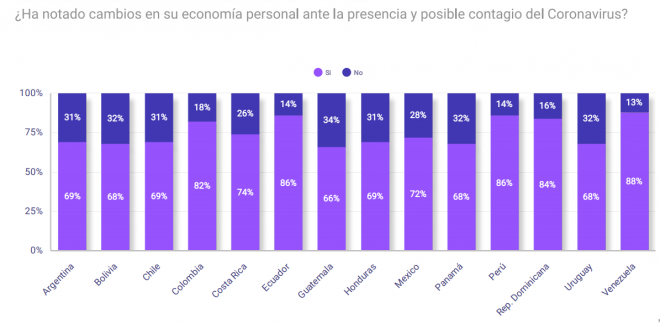 El 69% dice haber notado cambios en su economía personal, y el 31% dice que no. Entre los que reconocen cambios, el 60% destaca las «filas inusuales para adquisición de productos específicos»; el 54% notó «aumento desmedido de precios»; el 31% refiere «desabastecimiento»; el 29% «límites a la cantidad de bienes comprados», y el 16% «peleas por la adquisición de productos específicos».