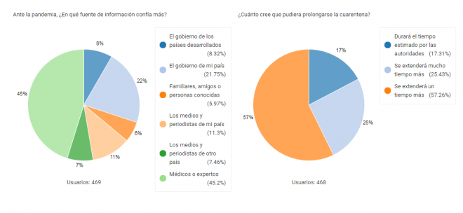 El 57% cree que la cuarentena «se extenderá un tiempo más», el 25% creo que «se extenderá mucho tiempo más» y 25,4% que se extenderá «mucho tiempo más» y el 17,3% simplemente dice que «durará el tiempo estimado por las autoridades».