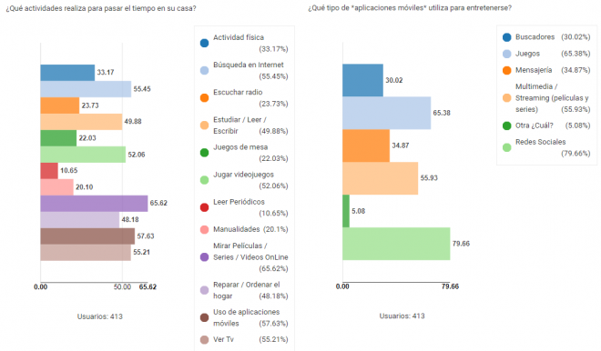 Las actividades más realizadas por los argentinos para pasar el tiempo en casa son múltiples pero gana ampliamente Mirar películas, series y videos online, 65,6%; usar apps móviles, 57,6%; búsquedas en Internet, 55,4%; ver TV, 55,2%; y jugar videojuegos, 52%. Luego vienen algunas actividades total o parcialmente off line como estudiar, leer y escribir, 50%; reparar y ordenar el hogar, 48%; realizar actividad física, 33%; jugos de mesa, 22%; y realizar manualidades, 20%. La TV, como ya había mostrado el relevamiento anterior de Livepanel, mantiene la vigencia y se diferencia de escuchar radio (23,7%) y leer periódicos (10,6), que son actividades menos realizadas.