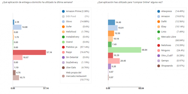 Entre las aplicaciones de entrega a domicilio la gran ganadora de la última semana es Pedidos Ya: el 57% de los sondeados dice haberla utilizada la última semana; el 16,7% usó Rapi; el 14,9% Glovo; el 11% utilizó la web del propio comercio, y el 5% Uber Eats.