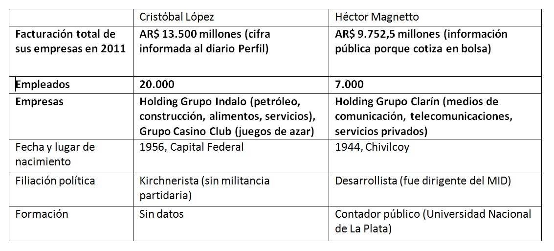 ¿Quién es más poderoso? ¿Cristóbal López o Héctor Magnetto? ¿Cómo se mide el poder? ¿Se mide por el tamaño y la diversificación de sus propiedades? ¿Se mide por la cantidad de empleados que tienen sus empresas? ¿Se mide por la facturación total? ¿Se mide por su cercanía con el poder de hoy o con el poder de ayer o el de antes de ayer?