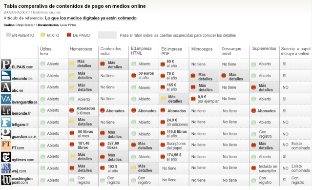Por otro lado, el portal lainformacion.com también publicó recientemente un muy buen gráfico interactivo para enterarse de qué están haciendo los diarios digitales en este sentido. The New York Times y los medios de News Corp. ya avisaron (oficial o extraoficialmente) que empezarán a cobrar por sus contenidos. Rupert Murdoch, presidente de NewsCorp, ya hizo el anuncio oficial.