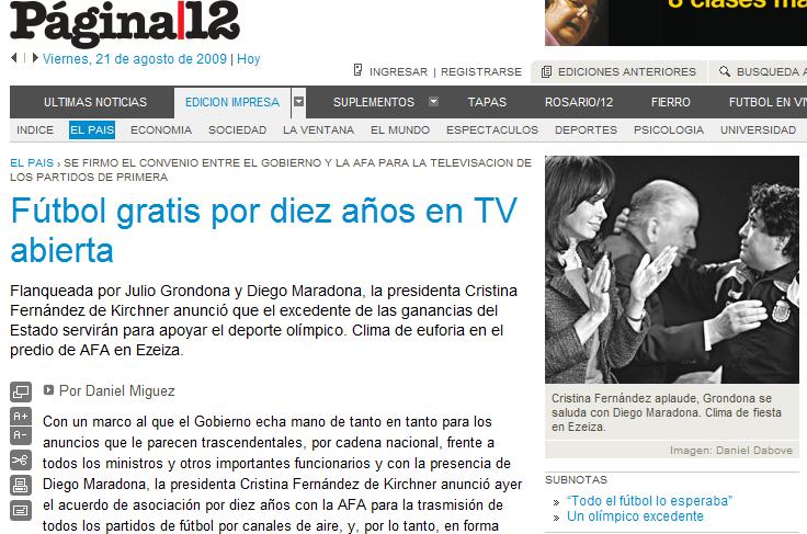 El fútbol, se confirma una vez más, no es para todos (como no es para todos en el resto del mundo sencillamente porque no todos están interesados en el fútbol). Es sólo del gobierno Kirchner, que ha sabido usarlo para que su propaganda tenga finalmente audiencia. El fútbol sigue siendo del cable (es decir, del grupo Clarín mediante Cablevisión) y del satélite (es decir, de DirecTV), es del grupo Olmos (gerenciador de Crónica TV y dueño de los diarios BAE y Crónica) y es de Alberto Pierri (dueño de Canal 26 y el sistema de cable Telecentro). Eso sí, pagarlo, lo pagamos todos.