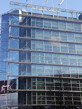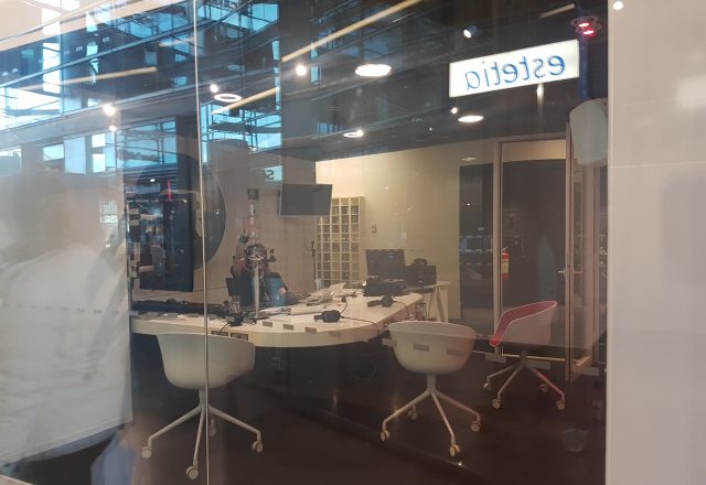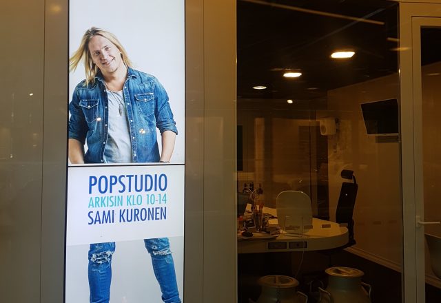Además, pasamos por el edificio del diario más tradicional el Helsinski Sonomat (que comercializa hasta la tapa de su edición impresa, el la foto un aviso de uno de los tres operadores telco convergentes). No estuve en su redacción pero pasamos por la planta baja del edificio donde funciona y donde coexisten también los estudios de varias radio de distintas emisoras (algunas transmiten en automático y otras tienen locutor/operador como todo personal al aire).