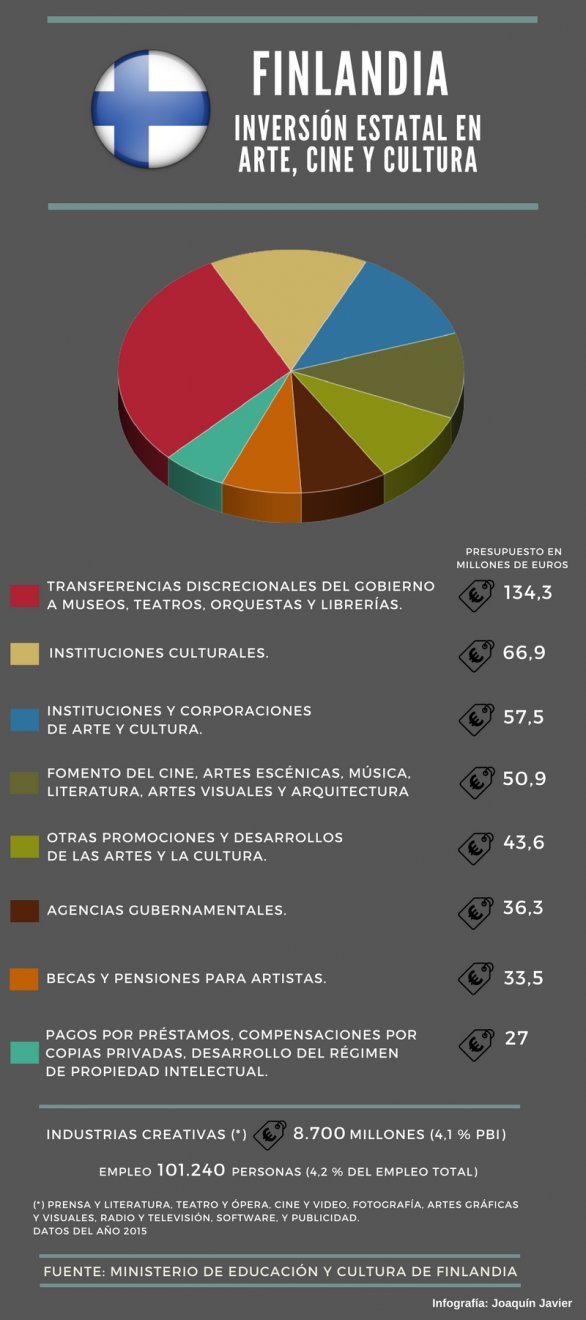 Finlandia no es simplemente otro país nórdico. Vecino de las económicamente ricas y culturalmente poderosas Suecia y Noruega (el PBI sueco duplica al finlandés y el noruego es 50% mayor), tiene una propia y fuerte identidad nacional y una gran inversión de fondos públicos en arte y cultura. El fomento público del sector editorial tiene mucho que ver con el mantenimiento del hábito de la lectura entre los finlandeses. Según datos oficiales, el país invierte unos 450,3 millones de euros en agencias e instituciones oficiales de promoción del arte, el teatro, los museos, las orquestas, las librerías, el cine, la música y la arquitectura.
