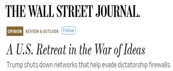 El mismo día que Trump anunciaba el cierre de La Voz de América Radicalizada, los enemigos de la democracia festejaron. Trump consiguió lo que por años intentaron sin éxito Hitler, Stalin, Mao, Fidel Castro, Gaddafi, Assad, Chávez, Xi Jinpin o Putin: eliminar la voz de los medios de comunicación globales estadounidenses que informaban sobre sus acciones dictatoriales y represivas.