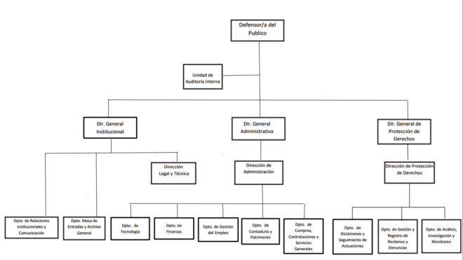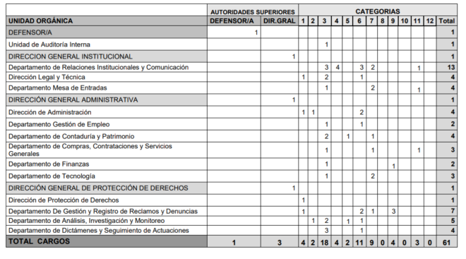 La nueva estructura (anexo III de la resolución) funcionará con 61 personas, distribuidas en tres direcciones, 1) general institucional (22 personas), 2) general administrativa (17), y 3) general de protección de derechos (18), además de una unidad de auditoría interna (1). El departamento más numeroso de este esquema es el de Relaciones Institucionales y Comunicación, que tendrá un total de 13 personas.