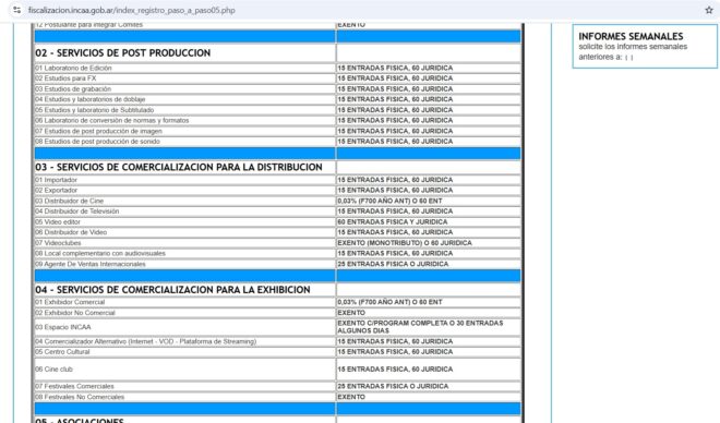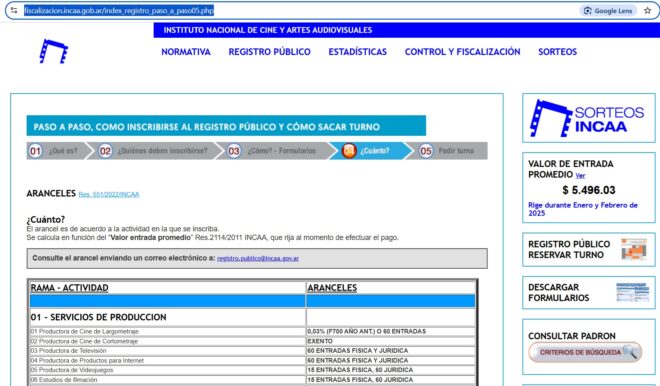 Los últimos aranceles vigentes publicados en el sitio fiscalizacion.incaa.gob.ar
