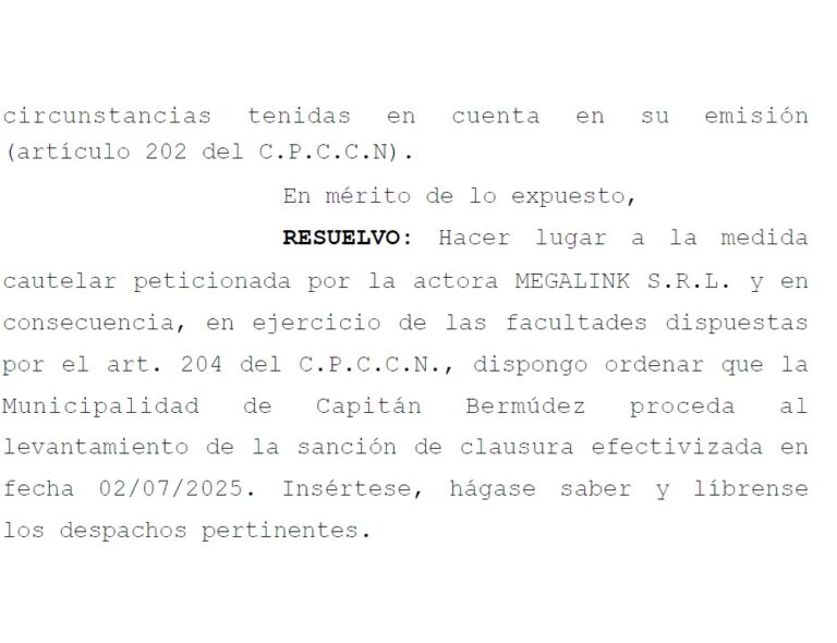 En este contexto, el magistrado resolvió dictar una medida cautelar innovativa, ordenando a la Municipalidad de Capitán Bermúdez que levante la clausura y se abstenga de adoptar nuevas acciones de hecho contra Megalink hasta tanto se resuelva la cuestión de fondo. Para ello, consideró cumplida la contracautela mediante juramento y aclaró que la decisión es provisoria y podrá modificarse si cambian las circunstancias.