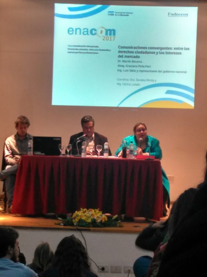 Entre el miércoles y este viernes se realizó en la Facultad de Ciencias de la Educación de la Universidad Nacional de Entre Ríos (UNER), en Paraná, el XV Enacom, y entre otros muchos temas se abordó la cuestión de las «comunicaciones convergentes» con una mesa integrada por Martín Becerra (UBA-UNQ), Graciana Peñafort (ex funcionaria del Comfer-Afsca, abogada de Cristina Kirchner y de su frente, Unidad Ciudadana, y desde el 12 de febrero de 2016 asesora letrada notarial de la Fiscalía de Estado de la gobernación de Santa Cruz) y por Luis Valle (director del Posgrado en TV digital y Telecomunicaciones de la Universidad Nacional de La Matanza y editor de la newsletter «Comunicaciones Electrónicas»).