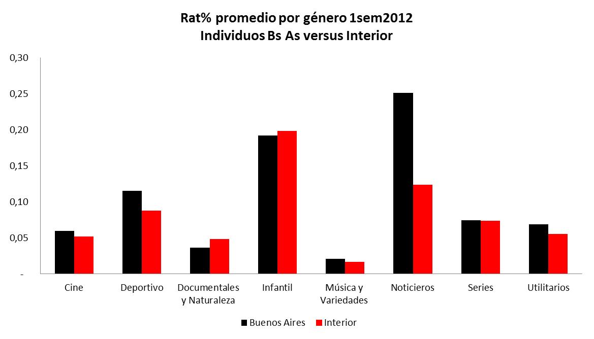 Fuente del gráfico: IBOPE MWS. Rat% promedio 1er semestre 2012. Lunes a Domingo de 06 a 30hs. Target Universo Total Individuos. Base incluye: Buenos Aires (Capital y GBA) e Interior (Gran Rosario, Gran Córdoba y Gran Mendoza). Los géneros se agrupan de la siguiente manera: Cine: Cinecanal Cinemax Europa Europa Film & Arts HBO HBO Plus East HBO Plus West HBO Signature HBO2 Infinito ISAT Max Max HD MGM Space Studio Universal TCM The Film Zone TNT Volver De Pelicula Golden.Deportivo: America Sports ESPN ESPN+ Fox Sports Fox Sports+ TyC Sports. Documentales y Naturaleza : Animal Planet Discovery Channel History National Geographic The Biography Channe. Infantil: Boomerang Cartoon Network Discovery Kids Disney Channel Disney Jr Disney XD Nickelodeon Sony Spin. Música y Variedades : Canal A Ciudad Abierta Cosmopolitan E! Entertainment Glitz Metro MTV Quiero Música en mi Idioma truTV VH1 Canal de las Estrellas. Noticieros: A24 C5N CNN Español CNN International Todo Noticias 26 TV. Series: A&E AXN Fox Fox Life FX ID Sony Syfy TBS Universal Channel Warner Channel. Utilitarios: Discovery Home & Health El Gourmet.com Magazine 24 TLC Utilisima.
