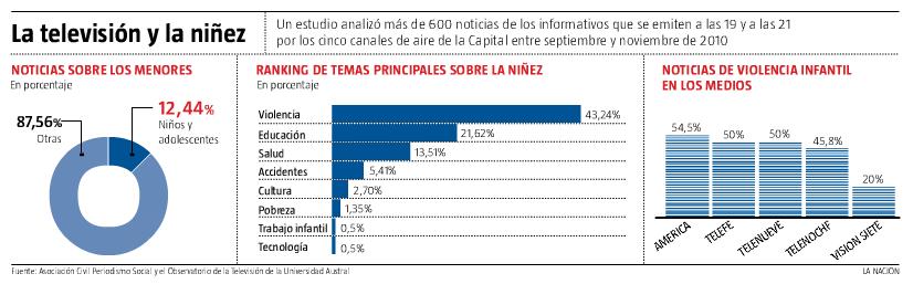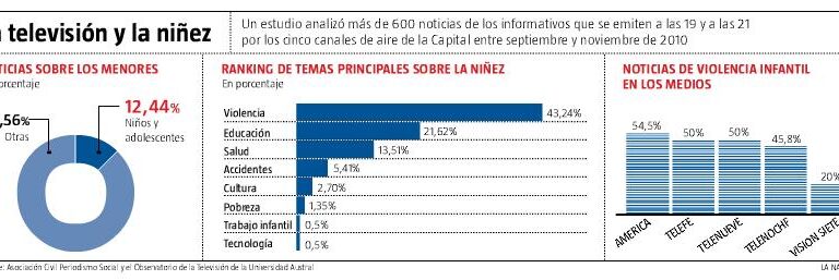 De acuerdo con esta investigación, la primera de este tipo en el país, en algunos noticieros la presencia de la violencia como factor predominante en la cobertura de la información sobre los niños en televisión es mayor. En América Noticias llega al 54,5%, algo más que Telefé Noticias y Telenueve , que le dedican el 50%. En otras palabras, la mitad o más de las referencias informativas a menores en la TV abierta está relacionada con hechos de violencia. En Telenoche ese número baja al 45%, y en Visión 7 , al 20 por ciento.