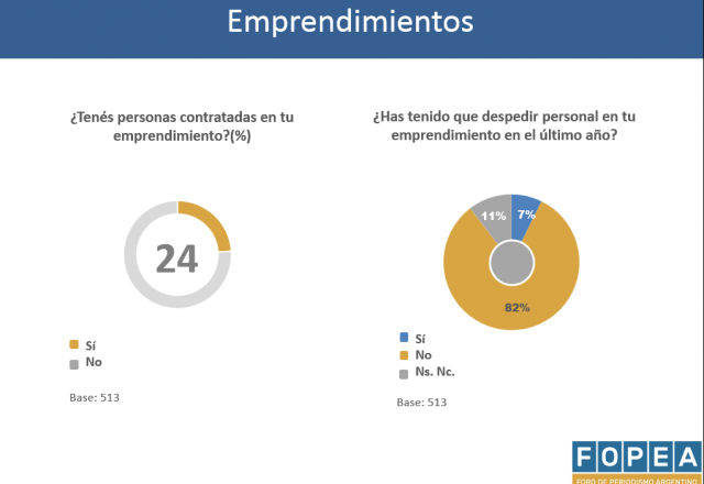 Pero no sólo eso: el 48% de los periodistas consultados para esta encuesta -908 de todo el país, ponderados por provincia y relevados entre el 16 de octubre y el 7 de noviembre de 2018- trabaja en un emprendimiento propio, ya sea en forma pura o combinada con un empleo en relación de dependencia. Y el 58% de los que trabajan en relación de dependencia se imaginan como emprendedores en el futuro. Más llamativo aún es que el 24% de los periodistas emprendedores tiene personas contratadas y que 82% de ellos no despidió a ningún colaborador en el último año. El 39% de los emprendedores periodísticos financia su propio proyecto profesional con ingresos de otras actividades; 34% con publicidad privada; 26% con un mix de privada y pública; el 10% con publicidad pública; y el 6% con suscripciones de usuarios.