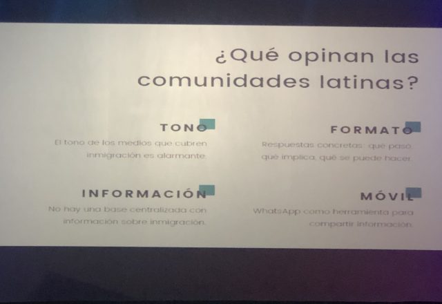 También en cuestión de regionalidad y minorías, Aldana Vales, de la New York University (NYU) compartió un estudio sobre las comunidades latinoamericanas en Estados Unidos, y presentó una solución ante el problema de la desinformación sobre inmigración. “El 52% de inmigrantes latinos usa WhatsApp en Estados Unidos, mientras que en otros grupos, el uso de la app no pasa del 20%. Teníamos que encontrar la manera de llegar a ellos a través del canal que estaban acostumbrados a utilizar para informarse: así surgió Documented Semanal”.
