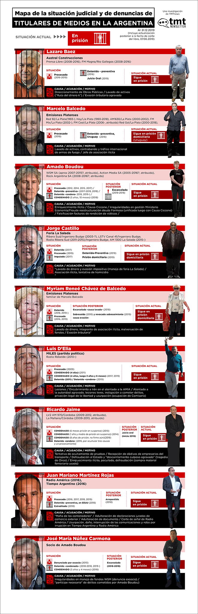 A principios de junio de 2019 había al menos 14 titulares de medios de comunicación argentinos en prisión (de los cuales cuatro tenían condenas) y otros 27 que estaban en libertad, pero sobre quienes recaían imputaciones, procesamientos o investigaciones judiciales o de organismos del ministerio público, así como denuncias de distinto tipo. De esos 27, dos se encontraban en libertad bajo fianza y uno de ellos falleció al momento del cierre del artículo.