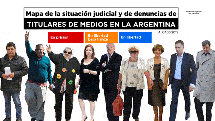 A principios de junio de 2019 había al menos 14 titulares de medios de comunicación argentinos en prisión (de los cuales cuatro tenían condenas) y otros 27 que estaban en libertad, pero sobre quienes recaían imputaciones, procesamientos o investigaciones judiciales o de organismos del ministerio público, así como denuncias de distinto tipo. De esos 27, dos se encontraban en libertad bajo fianza y uno de ellos falleció al momento del cierre del artículo.