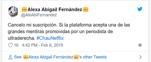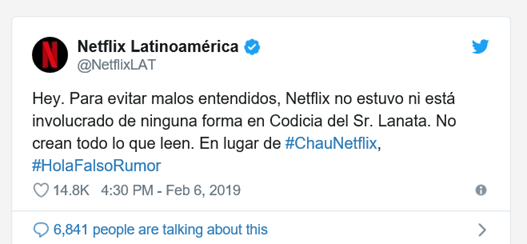 En el debate intervino el propio Netflix [probablemente a través de la agencia que gestiona sus redes sociales en la región]. La subsidiaria latinoamericana del sitio de streaming desmintió que tenga nada que ver con la realización de Lanata (una documental llamada Codicia que expondrá los casos más sonados de corrupción acontecidos bajo el gobierno de Cristina Kirchner y en los que están involucrados altos funcionarios, muchos de ellos actualmente en prisión).