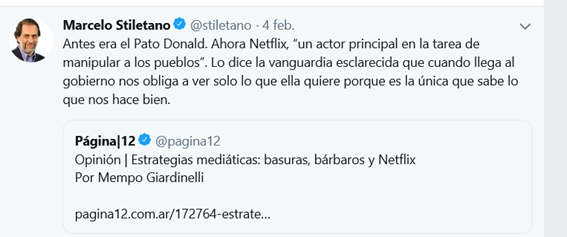 “Antes era el Pato Donald. Ahora Netflix, ‘un actor principal en la tarea de manipular a los pueblos’. Lo dice la vanguardia esclarecida que cuando llega al gobierno nos obliga a ver solo lo que ella quiere porque es la única que sabe lo que nos hace bien.