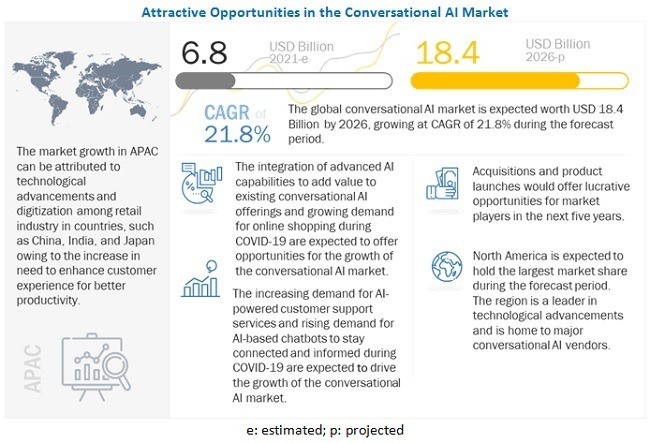 El mercado global de IA conversacional crecerá de US$ 6800 millones en 2021 a US$ 18.400 millones en 2026, a una tasa de crecimiento anual del 21,8%, según un informe del sitio Markets & Markets. Los principales factores que impulsan el crecimiento son la creciente demanda de servicios de soporte al cliente, la implementación omnicanal y la reducción de los costos de desarrollo de chatbots. La creciente demanda de chatbots basados ??en inteligencia artificial durante la pandemia por Covid-19 y un mayor enfoque en la participación del cliente son los principales factores que agregan valor a las ofertas de inteligencia artificial conversacional, detalla el estudio.