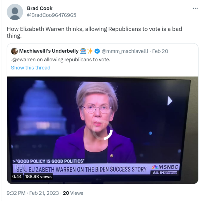 No todos los contenidos falsos tienen dueños conocidos. En marzo, un video falso circuló por Twitter (red social ahora rebautizada X). Tomado de un discurso de una senadora demócrata, cambió el texto para afirmar que las autoridades deberían quitarle el derecho al voto a los republicanos. Twitter/X luego dio de baja el posteo.